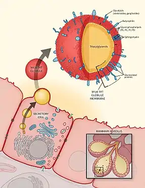 The milk fat globule is surrounded by a phospholipid trilayer containing associated proteins, carbohydrates, and lipids derived primarily from the membrane of the secreting mammary epithelial cell (lactocyte). This trilayer is collectively known as MFGM. While MFGM makes up only an estimated 2% to 6% of the total milk fat globule,[1] it is an especially rich phospholipid source, accounting for the majority of total milk phospholipids.[10][11] In contrast, the inner core of the milk fat globule is composed predominantly of triacylglycerols.