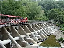 Situated about a 1 mile (1.6 km) upstream of the tube is a drift catcher used to stop large debris from reaching the tube. The catcher is 209 feet (64 m) long and 18 feet (5.5 m) high.[5][12] It was built at the same time as the tube. The catcher was modified in 1965 to accommodate the Erie Zoo's miniature railroad.[5] It underwent a $476,800 restoration from May to August 2010 to seal cracks, repair deteriorating concrete and inspect one of the bridge's retaining walls.[5]