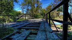 Mill Creek Bridge is a historic structure located in a rural area north of Clarence, Iowa, United States.The Cedar Bluff Bridge over the Cedar River was the first all-iron span built in Cedar County in 1877. Four more iron spans were built later that year, as were several others over the years before this bridge was completed in 1889. It is the only one of those bridges left, and one of the oldest pony truss bridges in the state of Iowa.[2] Citizens in Dayton Township petitioned the Cedar County Board of Supervisors in June 1888 for the bridge over Mill Creek. The supervisors contracted with Ward and Keepers of Clinton, Iowa to design and build the bridge. The 58-foot (1,800 cm) span was built on concrete-filled iron cylinder piers, with timber stringer approach spans.[2] Over the years sub-structural alterations have been made to the bridge. It has subsequently been abandoned and its deck is in a deteriorating condition. The bridge was listed on the National Register of Historic Places in 1998.[1]