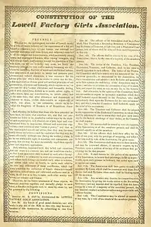 The Lowell mill girls were young female workers who came to work in textile mills in Lowell, Massachusetts during the Industrial Revolution in the United States. The workers initially recruited by the corporations were daughters of New England farmers, typically between the ages of 14 and 35.[1] By 1840, at the height of the Textile Revolution, the Lowell textile mills had recruited over 8,000 workers, with women making up nearly three-quarters of the mill workforce.