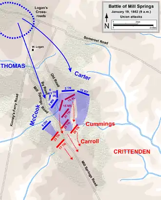 Union Brig. Gen. George H. Thomas received orders to drive the Confederates across the Cumberland River and break up Crittenden's army. Thomas left Lebanon and slowly marched through rain-soaked country, arriving at Logan's Crossroads on January 17, where he waited for Brig. Gen. Albin F. Schoepf's troops from Somerset to join him.[5] Crittenden, who until early January had remained in his headquarters in Knoxville, arrived at Mill Springs and realized that his inexperienced subordinate was in a dangerous situation. He devised a plan to attack the Union force before it could concentrate against him. One section of the Union Army, three brigades under Thomas, was located at Logan's Crossroads, while Schoepf's brigade was at Somerset, separated by rain-swollen Fishing Creek, which might be a sufficient barrier to prevent the forces from joining together quickly. Crittenden ordered Zollicoffer to attack the Union camp at Logan's Crossroads at dawn on January 19.[6]
