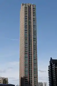 Millennium Centre is a postmodern[1] skyscraper in Chicago, Illinois in the city's Near North Side neighborhood. The building rises 610 feet (186 m).[2] It contains 59 floors,[1] and was completed in 2003. The architectural firm who designed the building was Solomon Cordwell Buenz & Associates.[2] Millennium Centre notably sold over 95% of its 350[1] residential units in September 2000, only two days after the developer had released information about the proposed structure; this occurred before the building had even been approved for construction by the City of Chicago.[3] The building's design incorporates a high-rise park on the roof of the 14th floor, with six two-story townhomes circling the park. Millennium Centre is topped off by a 10-foot (3 m) illuminated spire, which is included in the building's structural height.[2]