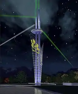 The site is severed by a main road, so the two structures will be linked via an underground arcade. The tower consists of three cylindrical concrete pillar-like structures varying in height and linked together near the tower's first peak using a disc-shaped section that is intended to house in its two floors an observation deck and a viewing restaurant. Around the pillars of the tower, three transparent stainless steel wings wrap around the base of the tower and gradually open outwards in a fan-like fashion as they extend up the height of the tower.[5]