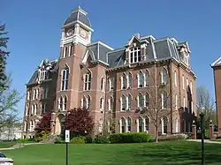 Located directly to the east of Hanna Hall, this structure was built between 1879 and 1899, and is a three-story, brick and sandstone building that was designed in the Second Empire style. It has a mansard roof and measures 158 feet long and 54 feet wide, with a cross-section that is 86 feet long and 50 feet wide. It was named for Alfred Brashear Miller, the president of Waynesburg College from 1859 to 1899. This building has housed administrative offices, classrooms, a laboratory, library, chapel, the Alumni Hall, and the "Martin Room."[2]