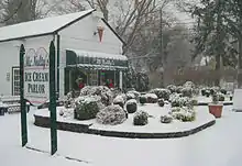 Along North Country Road is McNulty's, a family-owned ice cream parlor and a fixture of the hamlet, and a handful of inns and restaurants located in historic structures. Route 25A is of a more suburban character, with most businesses being corporate chains and located in strip malls. Also along Route 25A are multiple pizza parlors, a bagel store, a deli, and a local coffee shop and bar.