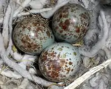 Both the male and female are involved in the nest building.[33] The male does most of the work, while the female perches on the shrub or tree where the nest is being built to watch for predators. The nest is built approximately three to ten feet above the ground.[33] The outer part of the nest is composed of twigs, while the inner part is lined with grasses, dead leaves, moss, or artificial fibers. The eggs are a light blue or greenish color and speckled with dots.[15] The female lays three to five eggs, and she incubates them for nearly two weeks. Once the eggs are hatched, both the male and female will feed the chicks.[33]