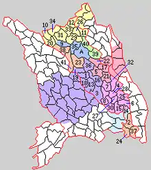1889 administrative map of five districts in Southeastern Saitama with the municipalities (numbers) and municipal associations (chōson kumiai; letters) of South Saitama District; colours indicate current/recent (2011) municipalities. 1. represents Iwatsuki Town, the district seat. Miyashiro Town, the last remaining municipality after the Great Heisei mergers, was created in 1955 by the merger of 39. Monma Village (百間村) and 40. Suka Village (須賀村).