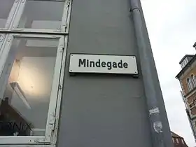 Mindegade is a 120 meters long street in Aarhus, Denmark, situated in the historic Indre By neighborhood. Mindegade runs from north to south from Fiskergade to Dynkarken and the square Europaplads. Mindegade gradually evolved from around 1606 as the city slowly extended southwards as the harbor was expanded and the river was covered up. The name is from some time before 1796 and refers to the nearby outlet of the river; the word "minde" is an old Danish world for river mouth and "gade" means street. Mindegade is fairly narrow and is a one-way street going from north to south.[1] *The street contains two listed buildings; Trods Katholm and Hans Broge's House.