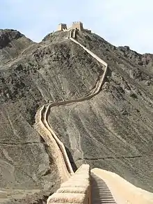 Around 1442, a wall was erected by the Ming in Liaodong to protect Han settlers from a possible threat from the Jurched-Mongol Oriyanghan.[9] In 1467–68, expansion of the wall provided further protection for the region from against attacks by the Jianzhou Jurchens in the northeast. An offshoot of the future main Great Wall line, this "Liaodong Wall" was of simple design: for the most part constructed by pouring mud between parallel rows of stakes, with moats dug on both sides, although stones and tiles were used in some parts.[10]