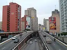 The Minhocão, officially "Via Elevada Presidente João Goulart", is a 3.5-kilometre (2.2-mile) elevated highway in São Paulo, Brazil. The highway was inaugurated in 1971 as Elevado Presidente Costa e Silva; its name was changed in 2016 after a law was passed changing names of all streets honoring people involved with the Brazilian military dictatorship.[1] The road is named after the minhocão, a quasi-fictitious earthworm-like creature.