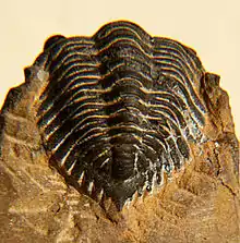 The headshield (or cephalon) may have a spine sticking forward from its border. The most forward lobe of the central raised area of the cephalon (or glabella) is diamond shaped. The eye has 5–8 lenses per vertical row (or dorso-ventral file). The spines at the back corners of the cephalon (genal spines) are shorter than glabella and narrow over the entire length. The border is not defined by a furrow, narrow at the front, but very wide at the sides of the cephalon and hardly defined on the genal spines. The tailshield (or pygidium) has 5 pleural segments in each of which the frontal pleural bands are as wide and elevated as the posterior bands, and both are flat. The axis has 7–10 rings. The 4 or 5 pairs of lateral pygidial spines (or lappets) are shorter than the area outside the axis (or pleural region) is wide, and they are mainly connected to the posterior pleural bands. The terminal pygidial spine slightly wider than axis, roughly triangular, twice as long as other pygidial spines.[2]