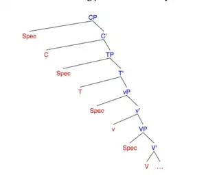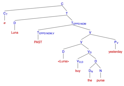 • PAST The Lexical Item for "past tense" is represented as the feature. Tense requires the presence of a DP subject and a verb; this is notated as TD,V. (Or more precisely as TEPP:D.NOM,V. The "EPP" notation stands for "extended projection principle" feature, NOM stands for "nominative case".) Tense first merges with a V-projection, and the output then combines the DP subject the girl, which, in some sense, merges twice: once within the V-projection, and once within the T-projection. (See discussion of Move below.)