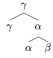 Merge can operate on already-built structures; in other words, it is a recursive operation. If Merge were not recursive, then this would predict that only two-word utterances to be grammatical. (This is relevant for child language acquisition, where children are observed to go through a so-called "two-word" stage. This is discussed below in the implications section.) As illustrated in the accompanying tree structure, if a new head (here γ) is merged with a previously formed syntactic object (a phrase, here {α, {α, β} }), the function has the form Merge (γ, {α, {α, β}}) → {γ, {γ, {α, {α, β}}}}. Here, γ is the head, so the output label of the derived syntactic object is γ.