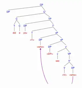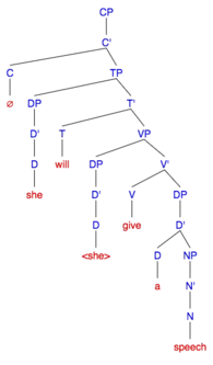 Movement as feature-checking: The original formulation of the Extended projection principle states that clauses must contain a subject in the specifier position of spec TP/IP.[15] In the tree above, there is an EPP feature. This is a strong feature which forces re-Merge — which is also called internal merge — of the DP the girl.The EPP feature in the tree above is a subscript to the T head, which indicates that T needs a subject in its specifier position. This causes the movement of <the girl> to the specifier position of T.[12]