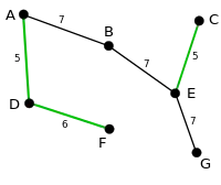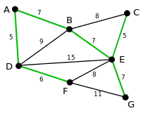 The algorithm half divides edges in two sets with respect to weights. Green edges are those edges whose weights are as small as possible. |