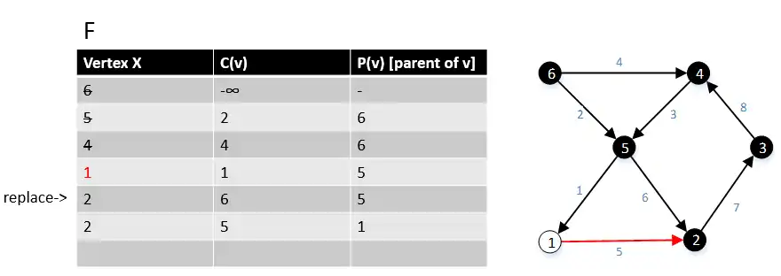 Initially, F = {s} where s is the starting point of the graph G and c(s) = -∞