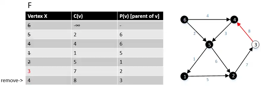 ![]() Next we move to the vertex 3 in the graph G, we found all the edge(3,w) ∈ E and their cost c(3,w), where w ∈ V. We find that the edge(3,4) > edge(6,4), so we remove the edge(3,4) and keep the edge(6,4). |