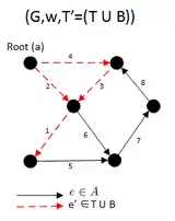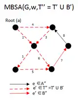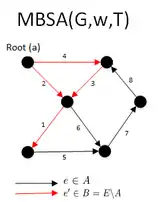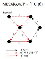 For a directed graph, Camerini's algorithm focuses on finding the set of edges that would have its maximum cost as the bottleneck cost of the MBSA. This is done by partitioning the set of edges E into two sets A and B and maintaining the set T that is the set in which it is known that GT does not have a spanning arborescence, increasing T by B whenever the maximal arborescence of G(B ∪ T) is not a spanning arborescence of G, otherwise we decrease E by A. The total time complexity is O(E log E).[5][4]