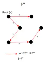 Another approach proposed by Tarjan and Gabow with bound of O(E log* V) for sparse graphs, in which it is very similar to Camerini’s algorithm for MBSA, but rather than partitioning the set of edges into two sets per each iteration, K(i) was introduced in which i is the number of splits that has taken place or in other words the iteration number, and K(i) is an increasing function that denotes the number of partitioned sets that one should have per iteration. K(i) = 2k(i − 1) with k(1) = 2. The algorithm finds λ* in which it is the value of the bottleneck edge in any MBSA. After λ* is found any spanning arborescence in G(λ*) is an MBSA in which G(λ*) is the graph where all its edge's costs are ≤ λ*.[4][7]