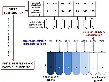 There are three main reagents necessary to run this assay: the media, an antimicrobial agent, and the microbe being tested. The most commonly used media is cation-adjusted Mueller Hinton Broth, due to its ability to support the growth of most pathogens and its lack of inhibitors towards common antibiotics.[23] Depending on the pathogen and antibiotics being tested, the media can be changed and/or adjusted. The antimicrobial concentration is adjusted into the correct concentration by mixing stock antimicrobial with media. The adjusted antimicrobial is serially diluted into multiple tubes (or wells) to obtain a gradient. The dilution rate can be adjusted depending on the breakpoint and the practitioner's needs. The microbe, or the inoculating agent, must come from the same colony-forming unit, and must be at the correct concentration. This may be adjusted by incubation time and dilution. For verification, the positive control is plated in a hundred fold dilution to count colony forming units. The microbes inoculate the tubes (or plate) and are incubated for 16–20 hours. The MIC is generally determined by turbidity.[23]