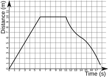 In the study of 1-dimensional kinematics, position vs. time graphs (also called distance vs. time graphs, or p-t graphs) provide a useful means to describe motion. The specific features of the motion of objects are demonstrated by the shape and the slope of the lines.[1] In Fig 1-1, the plotted object moves away from the origin at a uniform speed of 1.66 m/s for 6 seconds, halts for 5 seconds, then returns to the origin over a period of 7 seconds at a non-constant speed.