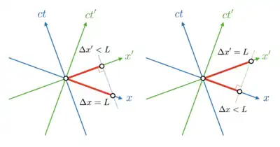- Max Born (1920) drew Minkowski diagrams by placing the ct′-axis almost perpendicular to the x-axis, as well as the ct-axis to the x′-axis, in order to demonstrate length contraction and time dilation in the symmetric case of two rods and two clocks moving in opposite direction.[19]