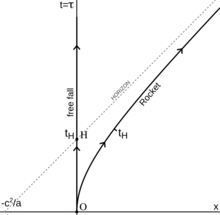 Let's take the example of the fall of an object dropped without initial velocity from a rocket. The rocket has a uniformly accelerated motion with respect to an inertial reference frame. As can be seen from Fig 6-2 of a Minkowski diagram in a non-inertial reference frame, the object once dropped, gains speed, reaches a maximum, and then sees its speed decrease and asymptotically cancel on the horizon where its proper time freezes at . The velocity is measured by an observer at rest in the accelerated rocket.