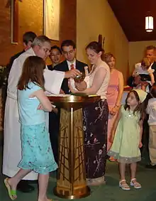 After the English Reformation, the Anglican baptismal rite in the 1549, Book of Common Prayer, which was based on the Sarum Rite, "took place at the church door and included signing with the cross on forehead and breast and an exorcism."[12] Similarly, the Lutheran Church, in its 1526 Baptismal Booklet contained a minor exorcism before the sign of the cross.[13]