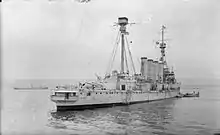 When the war began, Minotaur searched unsuccessfully for the German East Asia Squadron in the Pacific and the commerce-raiding light cruiser Emden in the Indian Ocean before she was transferred to the Grand Fleet at the end of 1914. She became flagship of the 7th Cruiser Squadron and was assigned to the Northern Patrol. Defence participated in the pursuit of the German battlecruiser SMS Goeben and light cruiser SMS Breslau, but Rear-Admiral Ernest Troubridge decided not to engage Goeben due to the latter's more powerful guns, heavier armour and faster speed. She then blockaded the German ships inside the Dardanelles.[19] The Admiralty ordered the ship to the South Atlantic in October to join Rear-Admiral Christopher Cradock's squadron searching for the German ships. Defence, however, had only reached Montevideo, Uruguay by 3 November when she received word that most of Admiral Cradock's squadron had been destroyed two days previously at the Battle of Coronel. The ship was then ordered to South Africa to escort a troop convoy to Great Britain. Defence departed Table Bay, Cape Town in December and rejoined the 1st Cruiser Squadron of the Grand Fleet as its flagship upon her arrival.[20]