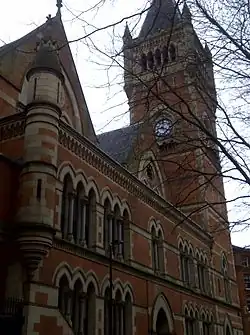 The style is Worthington's trademark flamboyant Flemish Gothic with a massive corner tower and a chimney stack styled as a campanile. The courts are constructed in red brick with sandstone dressings and steeply-pitched slate roofs. There is a profusion of animal carving by Earp and Hobbs.[5] Worthington drew both on his rejected designs for the Town Hall, and on his earlier plans for Ellen Wilkinson High School, although the central tower he used there is placed asymmetrically at the Police Courts, due to the constraints of the site.[3] The interior court rooms "have been preserved with relatively few alterations."[3]