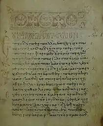 It contains Prolegomena, tables of the κεφαλαια (tables of contents) are placed before each Gospel, and subscriptions at the end of each Gospel.[3][4]