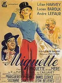 Miquette is a 1940 French comedy film directed by Jean Boyer and starring Lilian Harvey, Lucien Baroux and André Lefaur. It was one of two films made in France by the Anglo-German star Harvey, after emigrating from Nazi Germany.[1] It was her final film appearance, although she continued to act on stage.