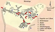The settlement is structured around Roman roads with many paved accesses. Around the west–east axis are the ruins of the residential homes. To the east, are the former baths constructed over a canal and composed of two buildings in a "L" shape ("Western Baths" and "Eastern Baths").[2][1][3] Each building has an entry into the massage hall, a gymnasium, changing room, the bathing space, which included the frigidarium (cold baths, tepidarium (warm baths) and caldarium (hot baths), and a communal latrine.[2][1] The halls are warmed by a hypocaust system that heated the floors of baths, which was located in the south part of the buildings. It was a subterranean system formed by pillars and arches, with tile, that allowed the circulation of warm air to produce heated environments, supported by kilns.