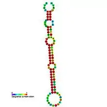 miR-196 is a non-coding RNA called a microRNA that has been shown to be expressed in humans (MI0000238, MI0000279) and mice (MI0000552, MI0000553).[1][2] miR-196 appears to be a vertebrate specific microRNA and has now been predicted or experimentally confirmed in a wide range of vertebrate species (MIPF0000031). In many species the miRNA appears to be expressed from intergenic regions in HOX gene clusters. The hairpin precursors are predicted based on base pairing and cross-species conservation—their extents are not known. In this case the mature sequence is excised from the 5' arm of the hairpin.