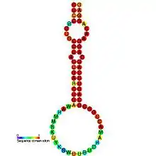 The miR-24 microRNA precursor is a small non-coding RNA molecule that regulates gene expression. microRNAs are transcribed as ~70 nucleotide precursors and subsequently processed by the Dicer enzyme to give a mature ~22 nucleotide product. In this case the mature sequence comes from the 3' arm of the precursor. The mature products are thought to have regulatory roles through complementarity to mRNA. miR-24 is conserved in various species, and is clustered with miR-23 and miR-27, on human chromosome 9 and 19.[1] Recently, miR-24 has been shown to suppress expression of two crucial cell cycle control genes, E2F2 and Myc in hematopoietic differentiation [2] and also to promote keratinocyte differentiation by repressing actin-cytoskeleton regulators PAK4, Tsk5 and ArhGAP19.[3]