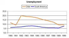 This deep economic recession of 1982–1983 was Chile's second in eight years. (In 1975, when GDP fell by 13 percent, industrial production plunged by 27 percent and unemployment increased to 20 percent). Additionally, inflation reached 375 percent in 1974—the highest rate in the world and almost twice the top level under Allende.[16] During the 1982–1983 recession, real economic output declined by 19%, with most of the recovery and subsequent growth taking place after Pinochet left office, when market-oriented economic policies were additionally strengthened.[2]
