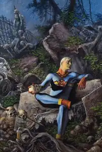 However Moran survived the blast, albeit with severe injuries and no memory of his time as Miracleman;[89] found in the Suffolk Marshes with burns and many broken bones, he pieced together his life and undertook a minor career in journalism.[82] He met Elizabeth Sullivan and the pair would marry in 1966.[90] While childless, they enjoyed a happy marriage, though Mike would feel guilt that his freelance writing career brought in less than Liz's more successful illustrating work. He was also plagued by migraines and a recurring dream - unknown to him a recollection of the Miracleman Family's demise. Moran was also troubled by an inability to recall the word he uttered in the dream. On 4th February 1982 he travelled to Larksmere in the Lake District to cover the opening of a new nuclear power plant, which is targeted by a terrorist group. The incident brings on one of Mike's migraines and while being taken to another room he instinctively reads the reversed word "atomic" on the back of a glass door. This caused Miracleman to return after 18 years, and he swiftly disabled the terrorists before flying out of the facility.[89] After a brief visit to the Moon[91] he returned to Liz and told her of his and Moran's history, though at this point he was unaware his time as a superhero was fabricated. She initially treats his story with stunned disbelief before finally accepting the evidence in front of her.[82] They spent the night together before he reverts to Moran and receives a phonecall from Johnny Bates - formerly Kid Miracleman and now CEO of Sunburst Cybernetics. The pair head to London to meet Bates, who tells them he survived the nuclear blast with his memory intact but his powers gone. While Mike is initially overjoyed at his friend's survival he soon realises Bates is lying and is actually still Kid Miracleman, having been corrupted by absolute power.[90] Calling up Miracleman, the pair battle but the intervening 18 years have seen his former protégé grow much more powerful,[92] and Kid Miracleman twice beats him near death in a battle across London. Miracleman is only spared when Kid Miracleman inadvertently speaks his own change-word and reverts to the 11-year old Bates. The shaken Morans leave Bates for the authorities and lay low for two months.[93]
