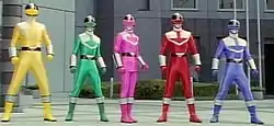Mirai Sentai Timeranger (未来戦隊タイムレンジャー, Mirai Sentai Taimurenjā, Future Squad Timeranger) is a Japanese tokusatsu television series and the 24th series in Toei's Super Sentai metaseries. Footage from this series was used in the American production Power Rangers Time Force. It aired from February 13, 2000 to February 11, 2001, replacing Kyuukyuu Sentai GoGoFive and was replaced by Hyakujuu Sentai Gaoranger.[1] The opening narration of the series announces, "People from the future in the year 3000 AD and one man have met by chance, for the sake of marking a new passage of time…!" (西暦3000年の未来人たちと一人の男が出会った。新しい時を刻む為に‥!, Seireki sanzennen no miraijin-tachi to hitori no otoko ga deatta. Atarashii toki wo kizamu tameni). Timeranger was released on DVD by Shout! Factory in North America on July 31, 2018.[2] This is the 9th Super Sentai Series to be released on Region 1 DVD in North America. The series debuted on February 13, 2000, when it replaced Kyuukyuu Sentai GoGoFive in TV Asahi's 7:30 JST time-slot, joining the recently-debuted Kamen Rider Kuuga in what would 3 years later become the Super Hero Time programming block.