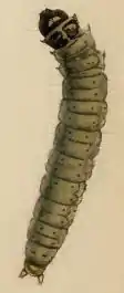 The larvae feed on Ulex europaeus, Cytisus scoparius, Cytisus nigricans, Genista germanica, Lupinus arboreus and Calicotome spinosa. On Ulex and Cytisus scoparius, they make a small hole in a bud that is not fully open and feed on the interior of the flower, before repeating the process in another flower. On Lupinus arboreus, the larvae feed on the leaves instead of the flowers. Larvae can be found from April to early May. Pupation takes place on the ground in a slight cocoon amongst leaves.