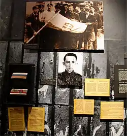 At the beginning of 1943, together with Adam Chalupec, Mirosław Iringh organized the "Underground Slovak National Committee" (SKN), which made contact with the representatives of the Home Army, and established civilian and military relations.[5] At the end of 1943 an agreement was reached between the SKN and the Home Army command, which called for the formation of a separate Slovak military unit within the structure of the Home Army - Platoon 535.[5] The unit was to be distinguished by armbands and a regimental standard in Slovak national colors, white-blue-red, as opposed to the red and white colors of the rest of the Home Army soldiers.[5] Iringh's armband was made by the wife of one of the Polish members of SKN, Jadwiga Szantarek-Szczudłowska. She sewed it out of a French broad riband military decoration which had been bestowed on her husband (Col. Mieczysław Szczudłowski) by Marshal Foch - the colors of the French flag are the same as that of the Slovak one.[1] Because of the similarity in colors, during the Warsaw Uprising, the civilians of Warsaw sometimes mistook the Slovak partisans for Frenchmen.[1]