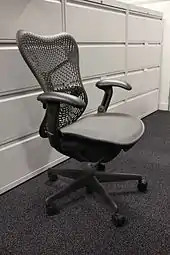 The Mirra chair is a Herman Miller product designed in 2003 by Studio 7.5 in Berlin, Germany. According to the manufacturer, the chair is made from 42% recycled material, and at the end of its useful life it is 96% recyclable by weight.[1] The chair has nine available adjustments intended to aid ergonomics: seat height, seat depth, tilt tension, tilt limiter, forward tilt, arm height, arm width, arm angle, and lumbar tension.[2][3]