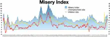 The misery index is an economic indicator, created by economist Arthur Okun. The index helps determine how the average citizen is doing economically and is calculated by adding the seasonally adjusted unemployment rate to the annual inflation rate. It is assumed that both a higher rate of unemployment and a worsening of inflation create economic and social costs for a country.[1]