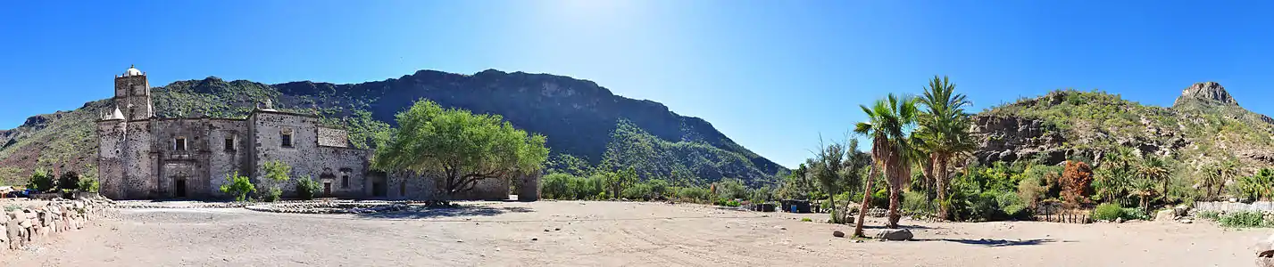 In October 1699, Piccolo returned with a contingent of Spanish soldiers and Indian converts and began to construct the mission. Piccolo dedicated the mission on December 3, 1699, and San Francisco Javier (also Xavier) became the second most enduring mission established in Baja California.[2] The mission was abandoned in 1701 because of a threatened Indian revolt, but reestablished by Juan de Ugarte in 1702. However, efforts to grow crops proved unsuccessful due to lack of water for irrigation and in 1710 the mission was moved a few kilometers south to its present location which had a dependable source of water from a spring. The energetic Ugarte constructed dams, aqueducts, and stone buildings. Between 1744 and 1758, Miguel del Barco was responsible for building what has been called "the jewel of the Baja California mission churches."[3]