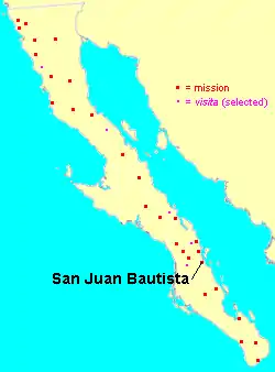 Ugarte left the mission because of ill health in 1709, and, thereafter, a Jesuit missionary was not always present. The mission was closed in 1721 when the remaining Christian Indians were moved to the new mission of Dolores in the territory of the Guaycura Indians south of San Juan Bautista. Surviving archaeological remnants of the abandoned mission include several sections of building foundations.[2]