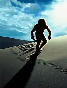 The film follows the last of the man-apes (Peter Elliott) as he wanders through the wilderness after his tribe is slaughtered by the aggressive humans who have invented the ax and have learned to make use of fire. He journeys through a savanna, an oasis, a desert, and eventually the shores of a beach. Along the way, he avoids the humans that killed his family and witnesses many fantastic sights of wildlife. After experiencing a hallucination brought on by ingesting a hallucinogenic plant (possibly a reference to the stoned ape theory), he realizes the stone ax that he has been carrying after finding it at the site where his tribe was killed is a weapon. When he comes across a human footprint at the ocean shore, he sniffs it and then starts hitting it, wanting revenge against the humans. But he then relents and tosses the ax into the ocean. The closing scene has him sitting mournfully on the beach as the sun sets. The closing text states that the "man-apes" were likely the first species humanity pushed into extinction.