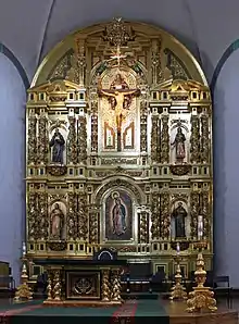 A prominent feature of the basilica is the Grand retablo, a 42-foot-high (13 m), 30-foot-wide (9.1 m), 16-ton altar-backing carved in cedar and covered in gold leaf which is stylistically reminiscent of 17th- and 18th-century Spanish colonial and Mexican colonial retablos.[6][7][8] The retablo's focal point is the Trinity, composed of the crucifix, God the Father depicted as an ancient patriarch, and the Holy Spirit depicted as a dove. Beneath the Trinity is Our Lady of Guadalupe. Four saints included on the retablo are Saint Francis of Assisi — patron of the mission's founding order, Saint Joseph, Saint Junípero Serra — the Mission's founder, and Saint Kateri Tekakwitha — significant for the area's Native American population.[7] The Retablo was designed and created by 84 artisans in numerous parts at the Talleres de Arte Granda in Madrid, Spain.