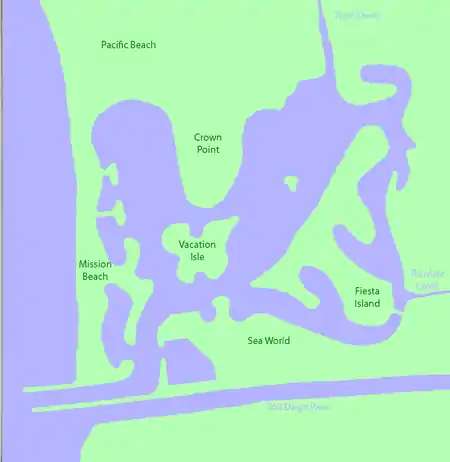 Mission Bay is a human-made saltwater bay located south of the Pacific Beach community of San Diego, California created from approximately 2,000 acres (810 ha) of historical wetland, marsh, and saltwater bay habitat. The bay is part of the recreational Mission Bay Park, the largest man-made aquatic park in the United States, consisting of 4,235 acres (17.14 km2), approximately 46% land and 54% water. The combined area makes Mission Bay Park the ninth largest municipally-owned park in the United States.