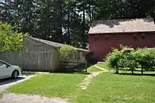 The property features several outbuildings, generally dating from the time of the restoration. A small one-room frame building in the southwest corner serves as a visitor center. Behind the house is a long one-story building that houses museum exhibits, as well as a storage and utility area. It is connected to the house itself by a 25-foot (7.6 m) grape arbor. Northeast of the house is a large barn-like building housing function facilities and a caretaker's apartment.[11]