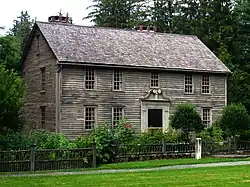 The mission house now stands on a lot approximately 0.4 acres (0.16 ha) in size. The layout of the house is a standard Georgian center-hall plan, with fireplaced rooms (a parlor to the left, and kitchen to the right) on either side of a central hall, which has a stairway to the second floor. Behind the parlor is an office space where Sergeant would have met with Indians. A diversion from the typical Georgian plan is the presence of a second entrance on the right side of the house, and a narrow hallway running from that entrance to the office. This made it possible for Sergeant's Indian visitors to reach his office without passing through the front of the house.[11] The front door is adorned with a remarkably well-preserved specimen of a Connecticut River valley front door pediment.[17]