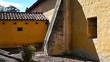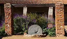 One year later Serra himself, along with Amúrrio and Pablo de Mugártegui, took up work on the Mission at San Juan Capistrano; the contingent, accompanied by eleven soldiers, arrived on October 30 or 31, 1776.[35] Upon their return to the site today known as "Mission Vieja," the party excavated the bells and constructed a new arbor; the original wooden cross was, to their surprise, still standing.[36] Serra celebrated High Mass in thanksgiving on November 1, 1776—celebrated ever since as the official founding date.[37] Due to an inadequate water supply the Mission site was subsequently relocated approximately three miles to the west less than 60 yards from the village of Acágcheme.[38][39][40] The new venue was strategically placed above two nearby streams, the Trabuco and the San Juan. Mission San Gabriel provided cattle and neophyte labor to assist in the development of the new Mission. Amúrrio performed the Mission's first baptism on December 19 of that year[41] (a total of 4,639 souls were converted at the Mission between 1776 and 1847.[42]) The first Indian marriage was blessed by Mugártegui on the feast of the "Espousals of the Blessed Virgin Mary," January 23, 1777. Mugártegui also presided over the first burial ceremony on July 13 (the first burial on Mission grounds would not take place until March 9, 1781).[43] The Registers of Baptisms, Marriages, and Burials are all intact and preserved at the Mission, as is the Confirmation Register (San Juan Capistrano is one of the few Missions to have retained this document). Serra visited the Mission for the first time since its founding and administered the Sacrament of Confirmation on October 22.[44] In 1778, the first adobe capilla (chapel) was blessed. It was replaced by a larger, 115-foot (35 m) long house of worship in 1782, which is regarded as the oldest standing building in California. Known proudly as the "Serra Chapel," it also has the distinction of being the only remaining church in which Serra is known to have officiated ("Mission Dolores" was still under construction at the time of Serra's visit there). Serra presided over the confirmations of 213 people on October 12 and 13, 1783; divine services are held there to this day. By the time of the chapel's completion, living quarters, kitchens (pozolera), workshops, storerooms, soldiers' barracks (cuartels), and a number of other ancillary buildings had also been erected, effectively forming the main cuadrángulo (quadrangle).